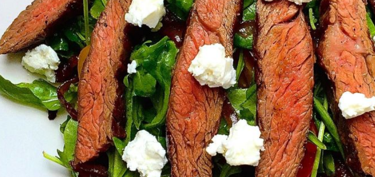 When ready to cook, heat the broiler with a rack 6 inches from the heat. Line a rimmed baking sheet with foil, then coat it lightly with The Spicy Olive's EVOO. Cut each pear half into four slices, then arrange them on one half of the prepared baking sheet. Remove the steak from the marine and set it on the other half of the sheet. Broil everything for 5 minutes, then use tongs to flip the steak and pears. Broil for another 5 minutes for medium-rare.