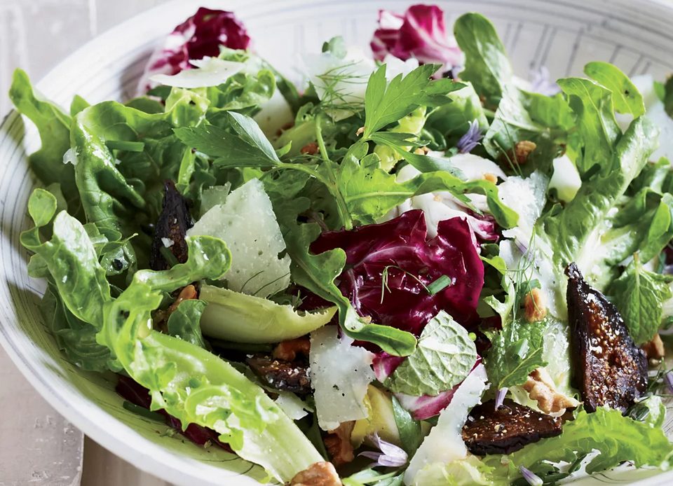 - Place mixed baby greens in a salad bowl and top with nuts, cheese and dried figs.