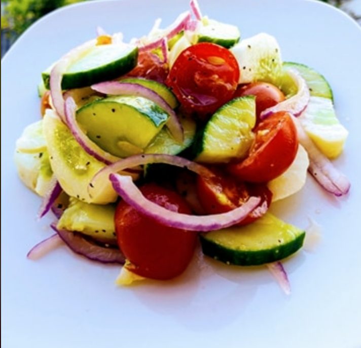 I love summer cucumber salads. This recipe has a Greek Salad inspiration to it. I also make Cucumber salads with The Spicy Olive’s Peach balsamic with a single varietal olive oil or our Basil olive oil, our new Ultra Premium white balsamic and our New Rose white balsamic are also terrific on this salad!( Cucumbers, tomatoes and thinly sliced onion ) Simply delicious!